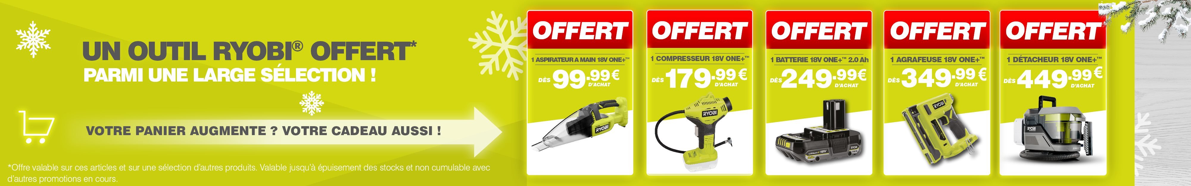 Profitez d’une offre exceptionnelle : Bénéficiez d’un produit RYOBI gratuit parmi une sélection selon le montant de votre achat :