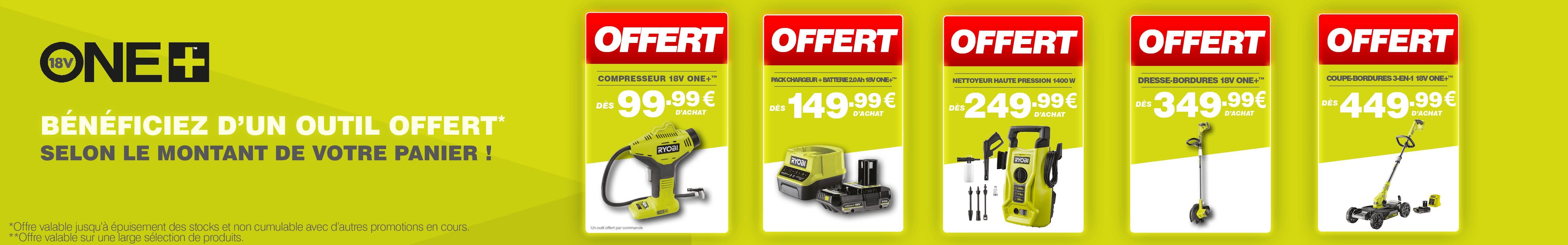 Comment bénéficier de la promotion ? Ajoutez vos articles au panier, puis choisissez votre cadeau dans le panier. 1 produit offert par commande. Offre valable dans la limite des stocks disponibles et non cumulable avec d'autres promotions RYOBI en cours.