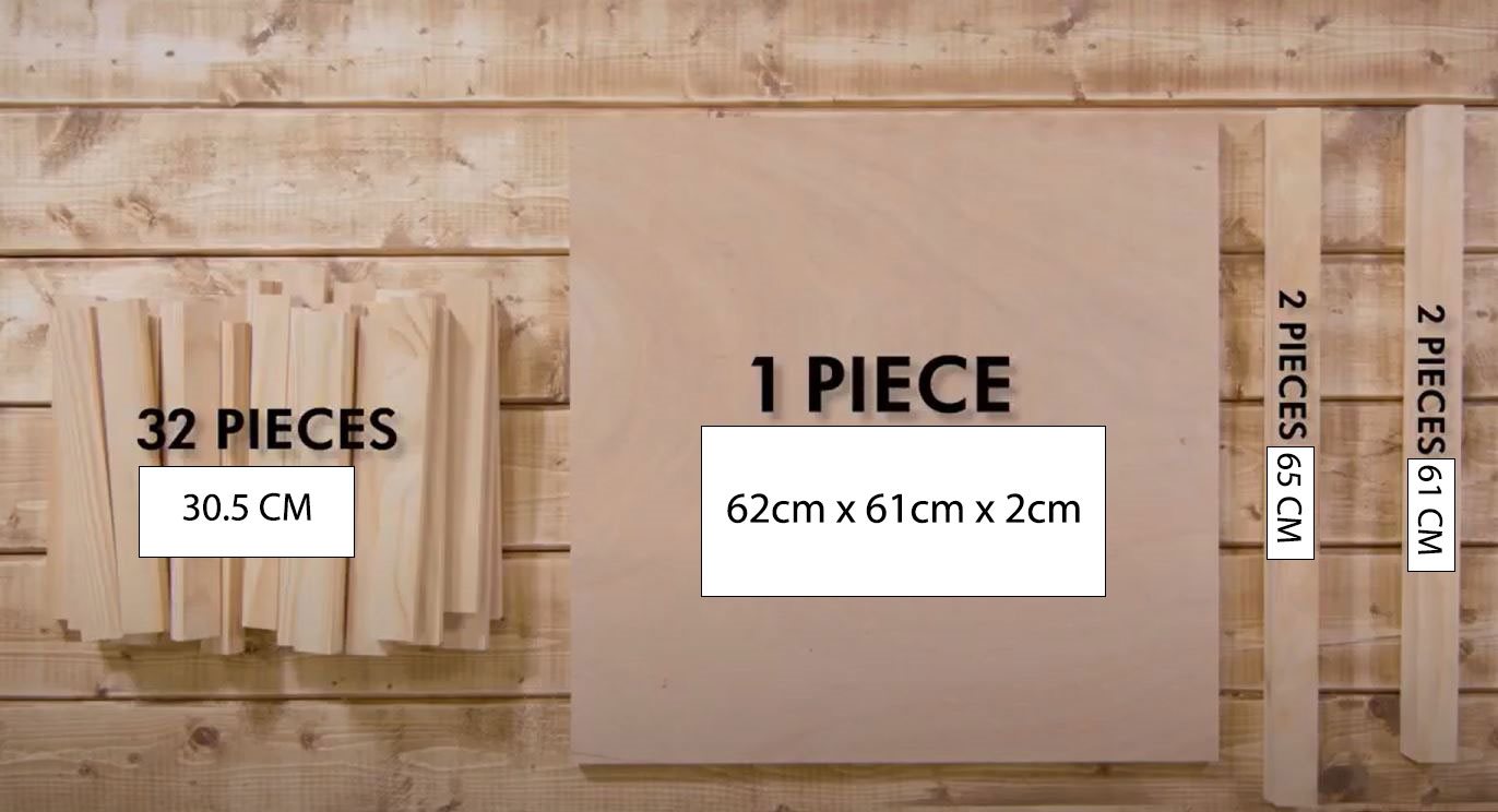 À l'aide de votre Scie à onglet radial 190mm 18V ONE+™, réalisez les coupes suivantes dans la planche en bois de pin : (32) 2.5cm x 5cm x 30.5cm (2) 2.5cm x 5cm x 61cm (2) 2.5cm x 5cm x 65cm