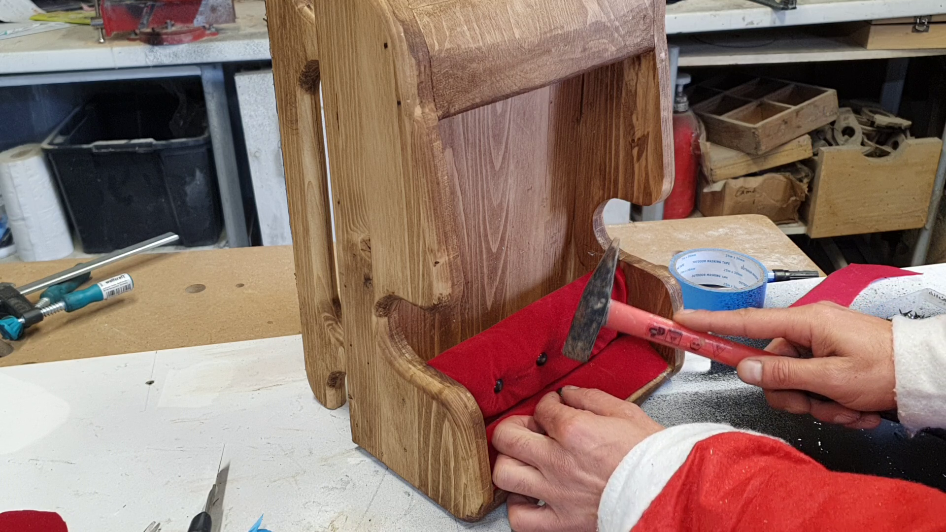 11. Utilisez des chiffons propres en guise de rembourrage et recouvrez le fauteuil avec du tissu rouge effet velours en le fixant avec le pistolet à colle.