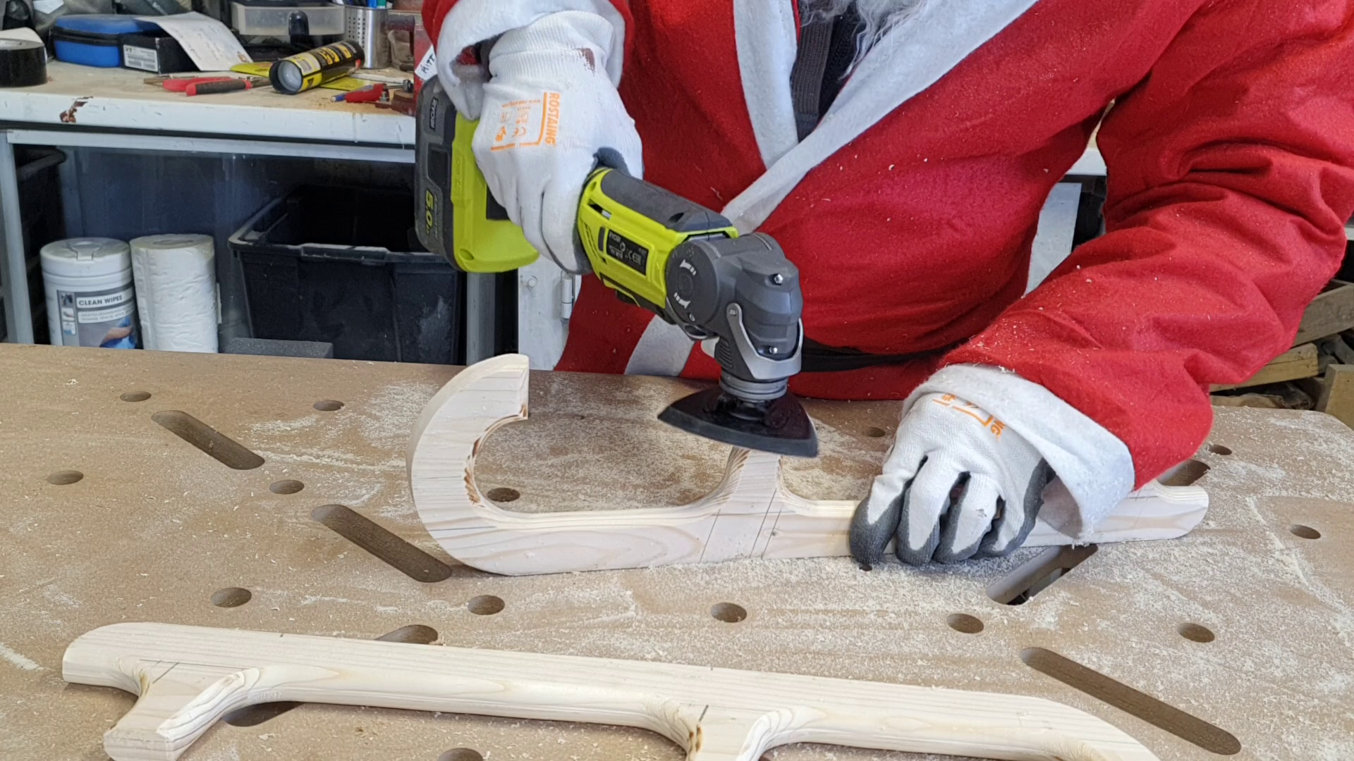 13. Il ne reste plus qu'à décorer et personnaliser le traîneau. Rien de mieux que le mini outil multifonction, avec une fraise ronde à bois.