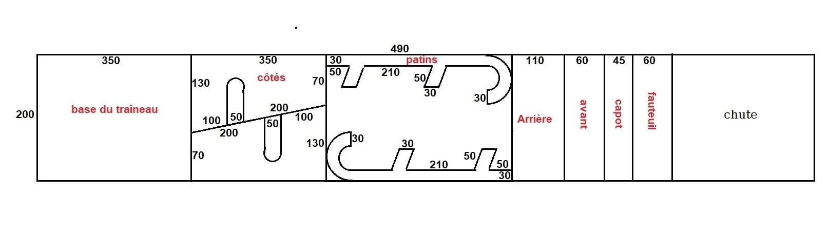 1. Tracez toutes les coupes à réaliser selon le schéma ci-dessous, tout le bois proviendra donc de la même planche. Pour gagner du temps dans les coupes, prenez comme "base" la largeur de la planche en guise de largeur du traîneau.