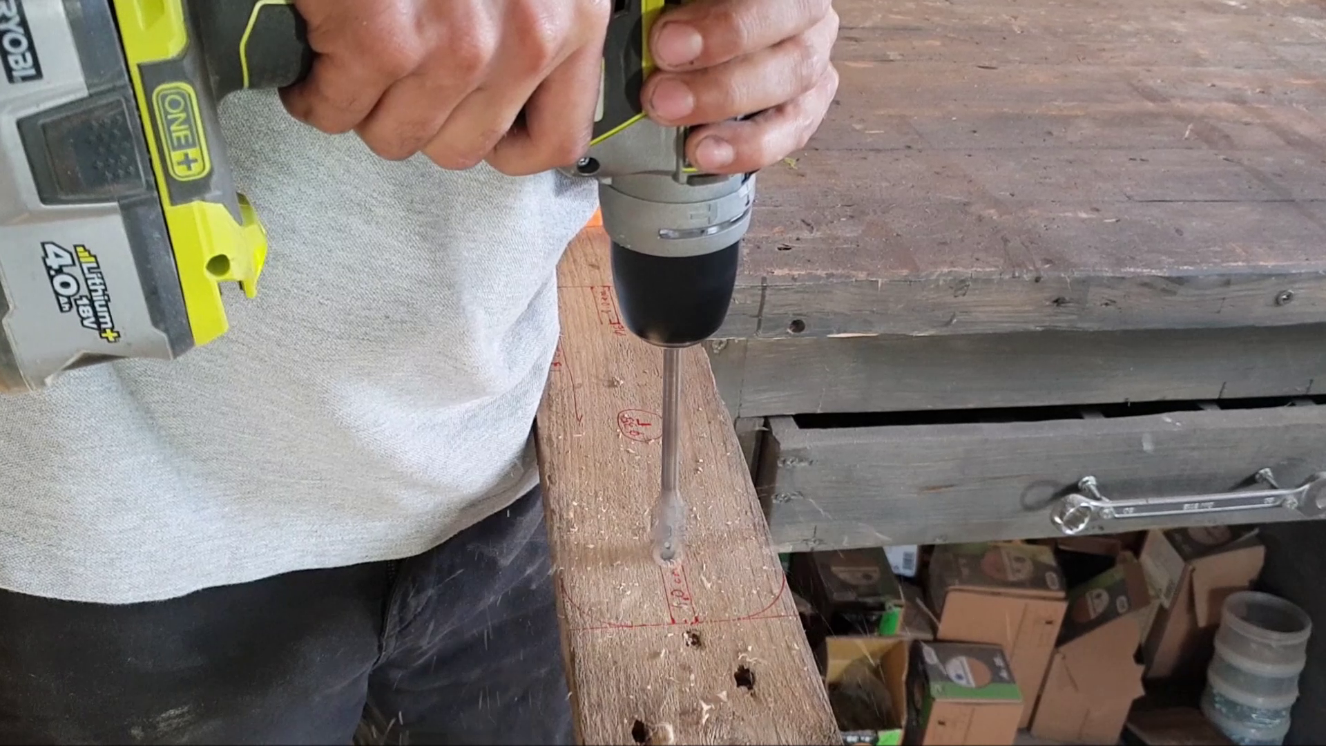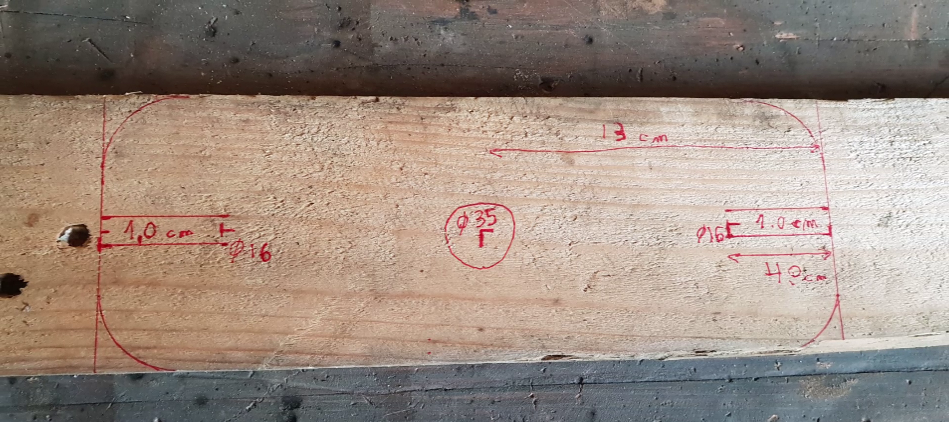 2- Percez 3 trous dessus, un de 35 mm au milieu pour passer le goulot de la bouteille et 2 de 16 mm de chaque côté pour passer le pied des verres ( peut varier selon vos verres, prenez soin des contrôlez avant).