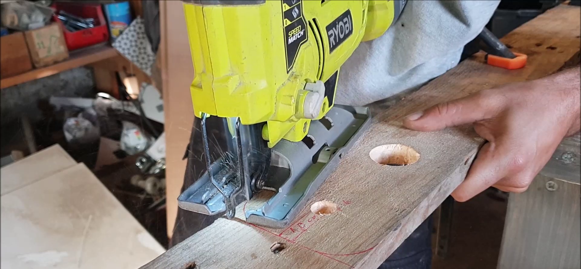 3- Découpez ensuite la planche avec la scie sauteuse, n'oubliez pas de faire les deux traits qui serviront à faire passer les pieds des verres.